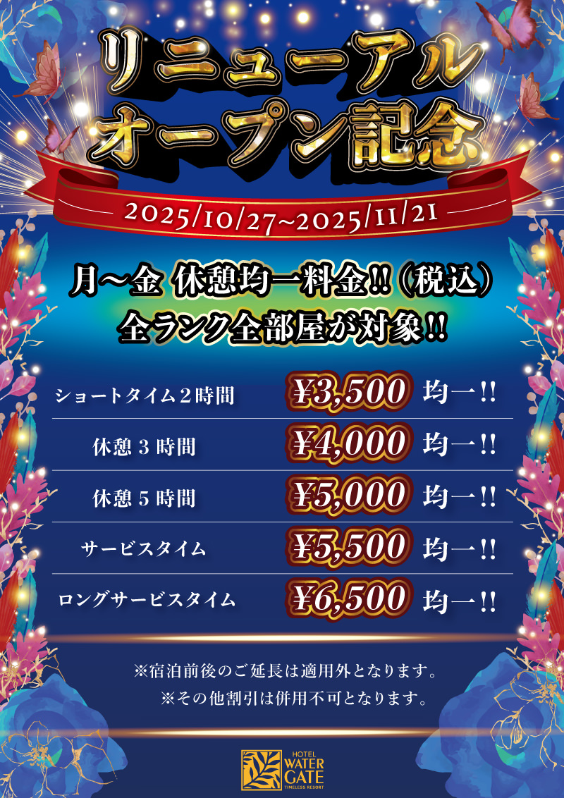 10/27(月)~リニュアル記念!!休憩が全室均一料金に!!