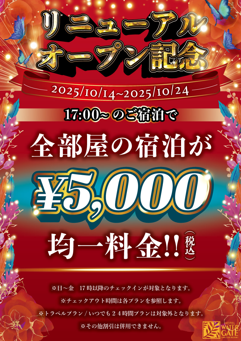 リニューアル記念!!17:00以降の宿泊が全室¥5,000均一!!